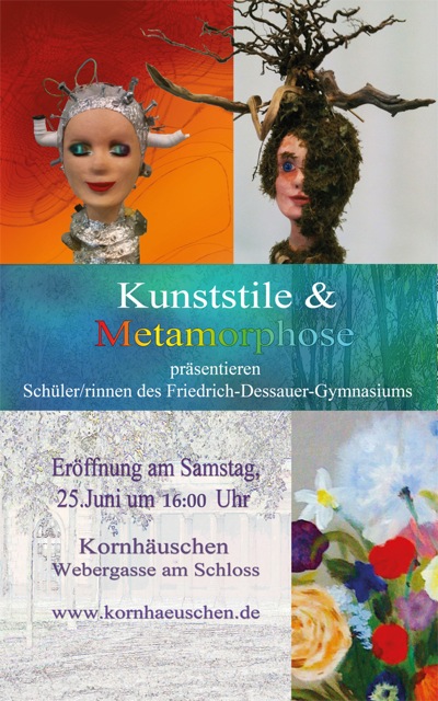 Das Kornhäuschen freut sich die Ausstellung Kunststile und Metamorphose zu eröffnen. Über unterschiedliche Kunststile wird das Thema Metamorphose aufgegriffen und in Malerei und Objekt umgesetzt. Die Arbeiten entstanden im Kunstunterricht von Didier Pignard im Friedrich-Dessauer-Gymnasium in Aschaffenburg.